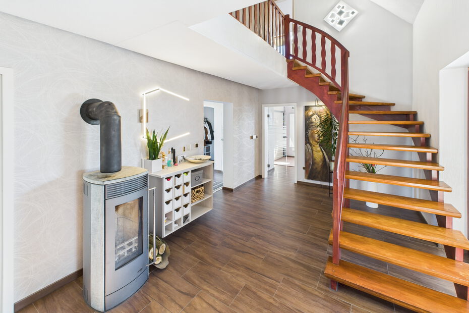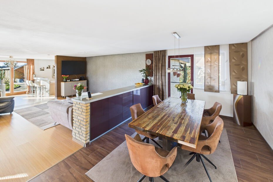 - Gepflegtes Einfamilienhaus mit durchdachter Raumaufteilung aus dem Jahre 1982 - Eine großzügige Wohnfläche von ca. 254 m² bietet vielfältige Möglichkeiten für ein aktives Familienleben mit viel Platz für gemeinsames Miteinander und ausreichend Rückzugsorte für jedes Familienmitglied - Zusätzlich stehen ca. 72 m² Nutzfläche im teilweise unterkellerten Bereich zur Verfügung, ideal für Hobbys oder sportliche Aktivitäten im eigenen Fitnessraum - Ein idyllisches Grundstück mit einer Fläche von ca. 1.220 m² welches liebevoll gestaltet wurde, bei dem der angelegte Gartenteich das grüne Herzstück bildet - Der offene und lichtdurchflutete Wohn- und Essbereich bildet das Zentrum des Hauses, der perfekte Ort um die Zeit mit seinen Liebsten zu genießen - Der hochwertige Parkettboden strahlt in allen Wohnräumen die gefragte Wärme und Gemütlichkeit aus, während qualitative Fliesen die Küche sowie Bäder zieren - Durch die hochwertige Einbauküche aus dem Jahr 2020 mit einer direkt angrenzenden Vorratskammer, wird das Kocherlebnis für die ganze Familie geboten - Das großzügige Schlafzimmer mit Badezimmer en Suite bietet mit seiner direkt angeschlossenen Loggia einen privaten Rückzugsort - Bad en Suite mit Regendusche und Badewanne lässt keine Wünsche übrig - Das praktische und moderne Kinderbadezimmer wurde 2020 erneuert und bietet Funktionalität auf aktuellem Ausstattungsniveau - Ein stilvoll gestaltetes Gäste-WC von 2017 sorgt auch bei Besuchern für Komfort - Erholung pur ermöglicht der Saunabereich, perfekt für Wellnessmomente daheim - Der Hauswirtschaftsraum bietet praktische Unterstützung im Alltag und sorgt für Struktur und Ordnung - Bodentiefe Holzfenster mit Doppelverglasung schaffen eine angenehme Wohnatmosphäre und bieten direkten Zugang zum Außenbereich - In der Immobilie sind sowohl eine Fußbodenheizung als auch Heizkörper für den höchstmöglichen Komfort verbaut, die Befeuerung erfolgt über eine Gaszentralheizung - Zwei große Terrassen mit sowohl West- als auch Nordausrichtung und gemauertem Außenkamin laden zu gemütlichen Abenden im Freien ein - Zwei Markisen sorgen an sonnigen Tagen für angenehmen Schatten und erweitern den Wohnraum nach draußen - Zwei Fahrzeuge finden bequem Platz in der geräumigen Doppelgarage mit elektrischem Tor - Das Gartenhaus eröffnet zusätzliche Möglichkeiten, ob als Hobbyraum, Werkstatt oder Lagerfläche - Ein idyllischer Gartenteich rundet das Gesamtbild harmonisch ab und bringt Natur direkt ans Haus - 360° Rundgang der Immobilie: https://tour.giraffe360.com/003b6c3541ed46f39cdc1f2ef2ba1963/Ausstattung