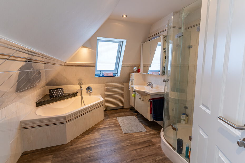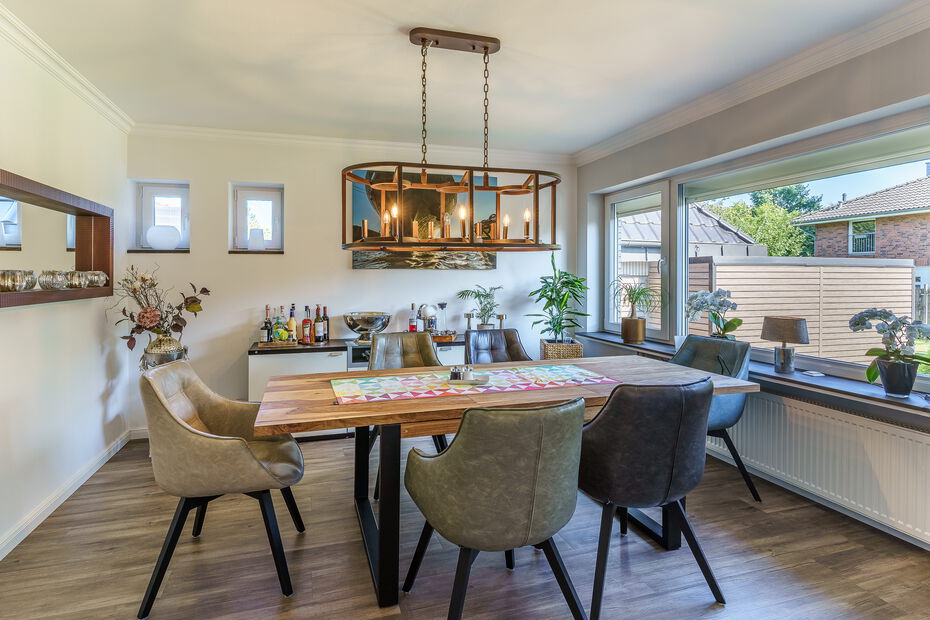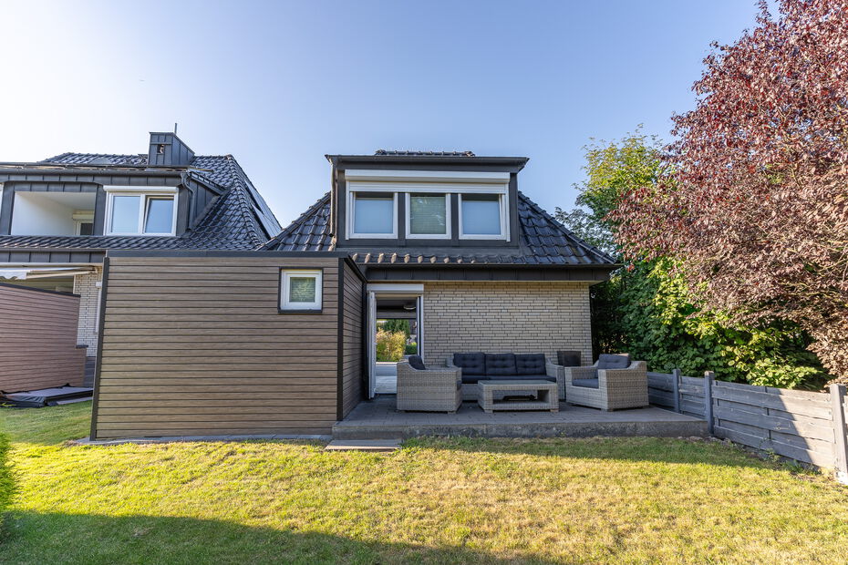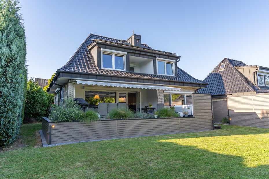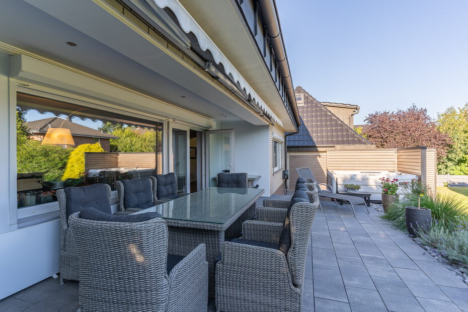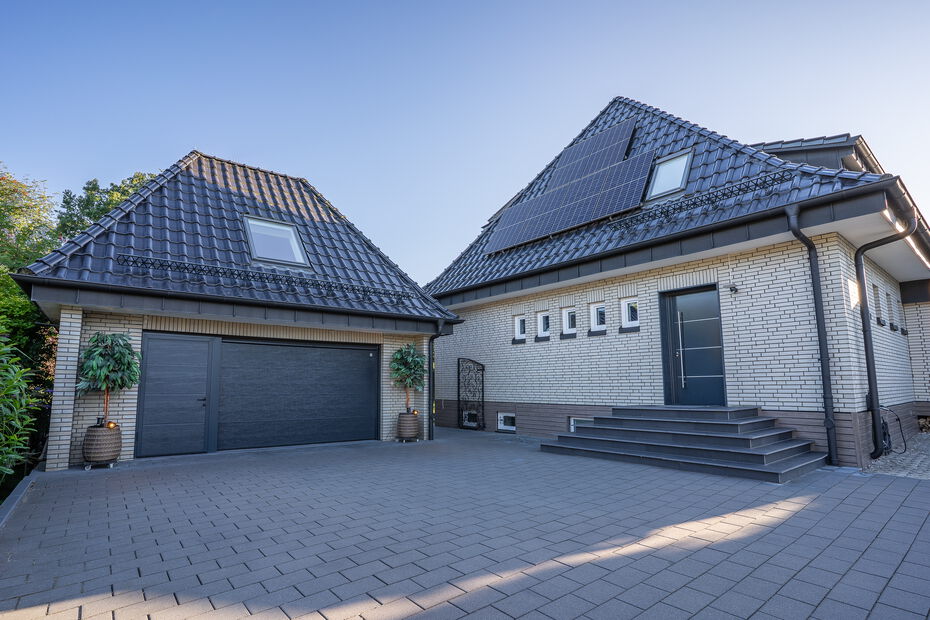 - Repräsentatives Einfamilienhaus auf einem ca. 1.160 m² großen Grundstück in idyllisch ruhiger und grüner Lage von Hamburg-Bramfeld - Solide Massivbauweise aus 1975, in den letzten Jahren umfassend modernisiert und technisch auf den neuesten Stand gebracht - Ca. 290 m² Wohn- und Nutzfläche, verteilt auf acht Zimmer, drei hochwertige Bäder, ein Gäste-WC sowie ein wohnlich ausgebauter Spitzboden - Großzügiger, lichtdurchfluteter Wohn- und Essbereich mit offenem Grundriss, großen Fensterfronten und traumhaftem Blick in den liebevoll gestalteten Garten - Edler Designboden in moderner Holzoptik im Erdgeschoss sorgt für eine warme und stilvolle Wohnatmosphäre - Hochwertige, weiße Hochglanz-Einbauküche – ideal für gesellige Kochabende mit Familie und Freunden - Sonnenterrasse (ca. 35 m²) mit beheiztem Whirlpool, ganztägiger Besonnung und einer elektrisch ausfahrbaren Markise - Im Obergeschoss befinden sich drei gemütliche Schlafzimmer sowie ein Zugang zur überdachten Loggia – perfekt für entspannte Stunden im Freien - Drei modernisierte Design-Bäder mit bodengleichen Duschen, stilvollen Armaturen und geschmackvoller Ausstattung - Besonderes Extra: Wohnlich ausgebaute Garage mit separatem Zugang, ausgestattet mit Wohnzimmer, Bar, Bad und Schlafzimmer im Obergeschoss – ideal als Gästebereich oder für heranwachsende Kinder - Eigene kleine Terrasse inklusive Zukunftssichere Haustechnik: vollständige Erneuerung der Elektroanlage, 10 kWp PV-Anlage mit BYD-Speicher und Fronius-Wechselrichter Premium Wärmepumpe (Viessmann, Baujahr 2025) sorgt für nachhaltigen und kosteneffizienten Wohnkomfort - Hochwertige Fenster und Türen mit programmierbaren Jalousien - Drei neu gedämmte Satteldächer, gedeckt mit eleganten, anthrazitfarbenen, matt lasierten Dachpfannen - Großzügiger Vorhof mit Platz für mindestens fünf Fahrzeuge - Attraktive Ausbaureserve: genehmigter Bauantrag samt statischer Berechnung zur Erweiterung um 2–4 zusätzliche Zimmer (ca. 60 m²)Ausstattung